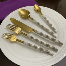 Luxurious Golden Stainless Steel Flatware Set – 5 Piece Twisted Design Silverware for Elegant Dining