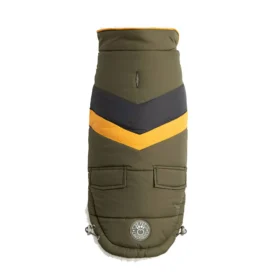 GF Pet Alpine Puffer – Dark Khaki | Retro Chevron Design with Sherpa Lining