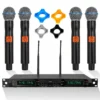 Experience unparalleled audio clarity with our 4-channel wireless microphone system. The DJ microphone system is designed for professional performance and features a unidirectional pickup pattern and UHF transmission for minimal interference. This wireless karaoke microphone for singing delivers consistent sound quality with an impressive operating range of up to 150 meters and robust signal stability.