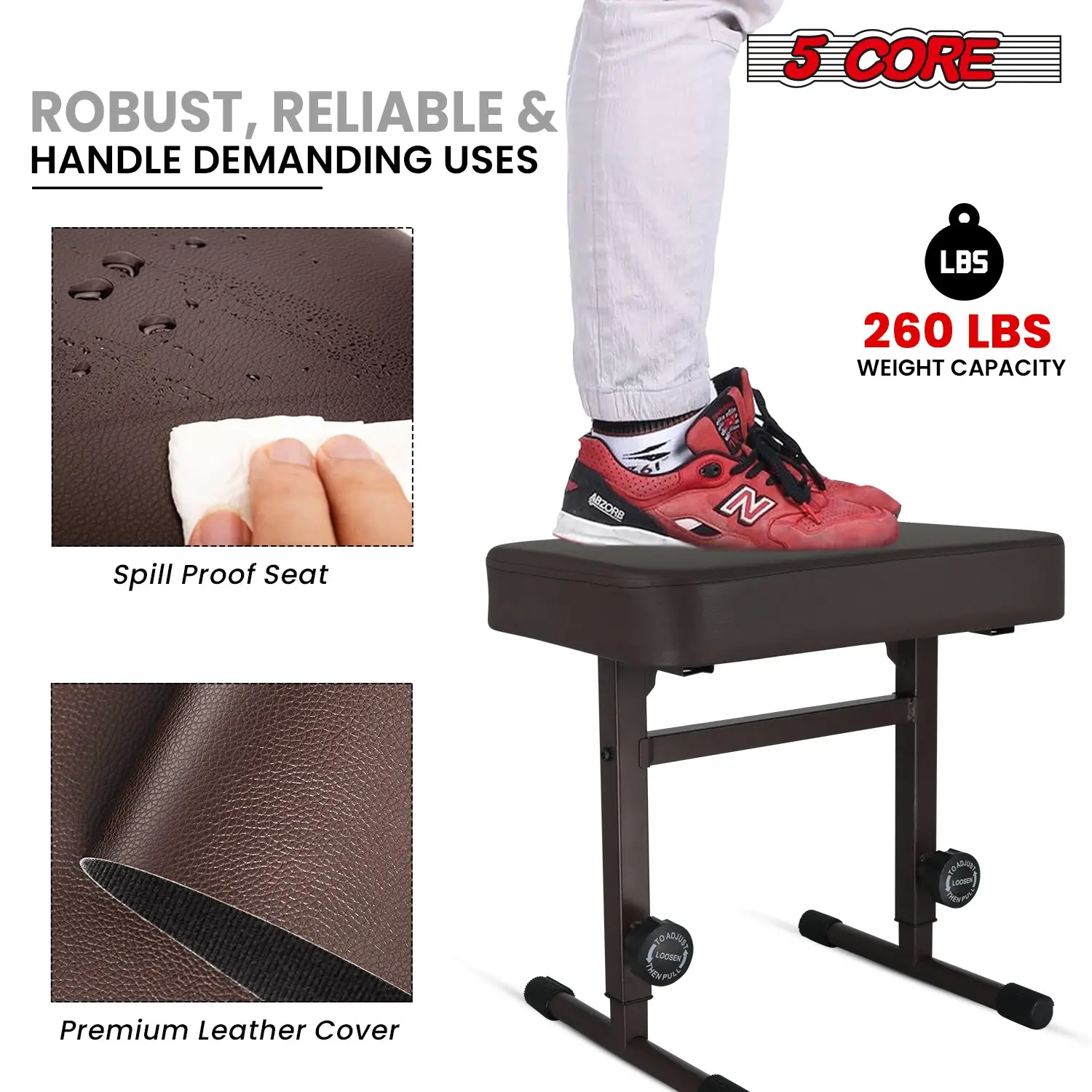 The 5CORE professional padded keyboard bench offers exceptional support with a 260 lb weight capacity, perfect for adults and kids. The padded 3-inch thick breathable sponge seat ensures comfort during long playing sessions, while the adjustable height (17 inches to 22 inches) and 5 position gear system allow easy customization. Built with durable materials like metal alloy, leather, and wood, this musician stool is designed to last. Its compact design makes it easy to transport and store. A beginner-friendly and reliable piano stool for home, studio, and stage setups, combining functionality with comfort.