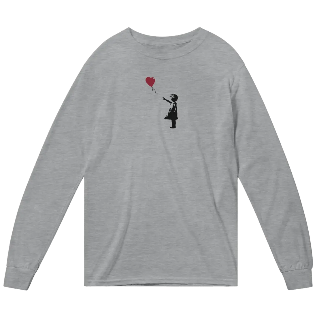 Iconic Banksy Artwork: This long sleeve shirt features the renowned Banksy artwork, ‘The Girl with a Red Balloon’. The design showcases a young girl reaching for a red heart-shaped balloon, a symbol of hope and despair that has captivated hearts worldwide.