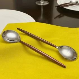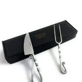 Handcrafted Set of 2 Salad Servers: Elevate your dining experience with the Vibhsa Salad Serving Set. Made from durable stainless steel with a sleek silver finish, this set features a stylish black handle with a unique twisted design.