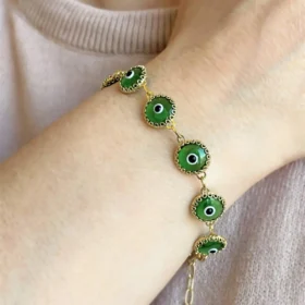 10 Beads Mint Green Evil Eye Women Gold Plated Silver Link Bracelet – Ward Off Bad Luck and Envy